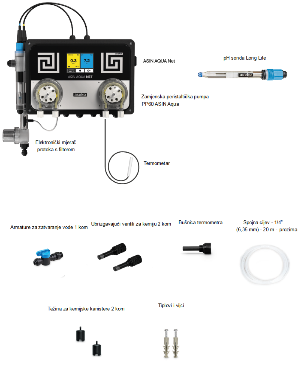 Dozirna stanica Aseko Asin Aqua Net Dose je dozirni stroj dizajniran za učinkovitu i pouzdanu obradu bazenske vode u privatnim bazenima, pogodan za upotrebu u bazenima i hidromasažnim kadama volumena do 250 m3. Opremljen je pH sondom za automatsku regulaciju pH vrijednosti i omogućuje vremenski kontrolirano doziranje klora. Ima ugrađeni LAN priključak za spajanje na internet. Pomoću iPool LIVE aplikacije na svom mobilnom telefonu možete provjeriti sve postavljene vrijednosti kvalitete bazenske vode i događaje povezane s radom bazena i doziranjem kemikalija.