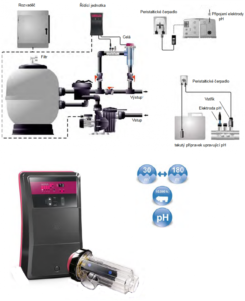Profesionalni sustav elektrolize soli sa samočistećim elektrodama kroz promjenu polariteta. Elektrode smještene u prozirnu ćeliju. Za privatne bazene do zapremine 180 m 3 . Postavka proizvodnje klora u 5 razina od 0 do 100%. Uređaj je opremljen LED indikatorom za signalizaciju visokog ili niskog sadržaja soli. Regulacija proizvodnje klora na temelju napona (ORP). Opremljen je detektorom plina. Izbor opreme uključujući kontrolu i regulaciju pH. Opcija s kontrolom pH uključuje peristaltičku pumpu za doziranje i pH elektrodu s kalibracijskim setom. Kompaktni držač elektrode može se naručiti zasebno.