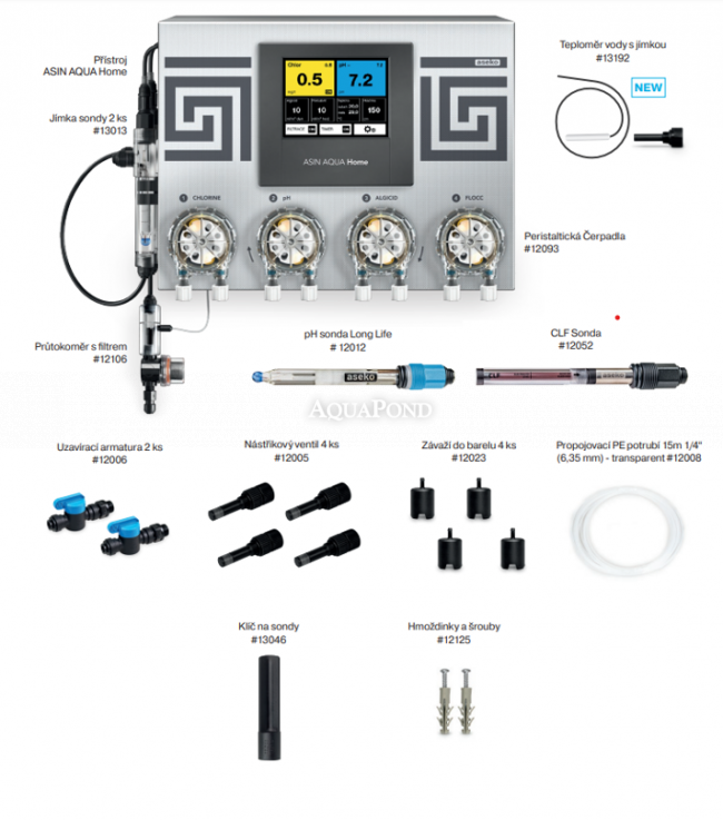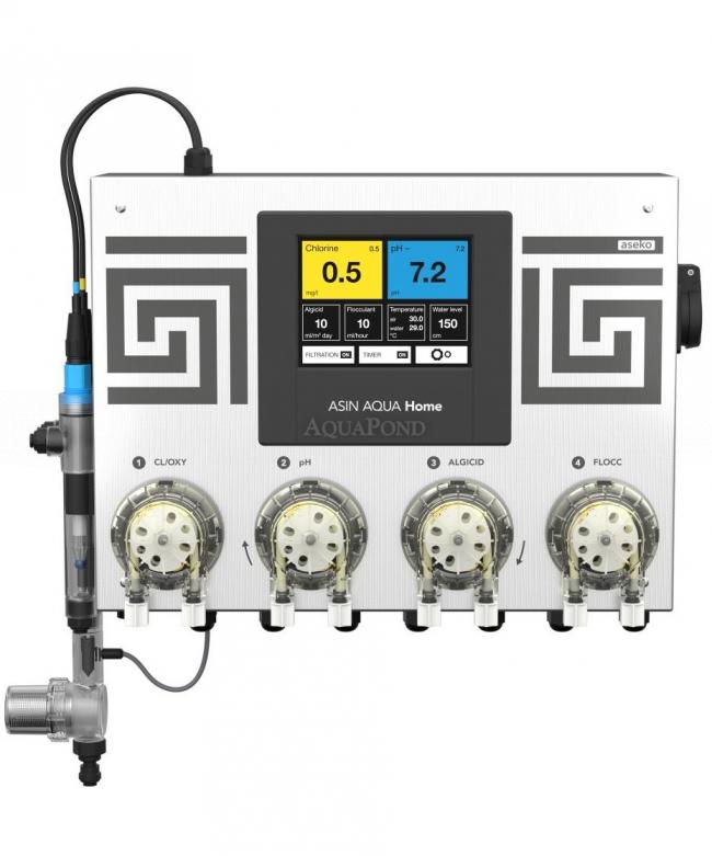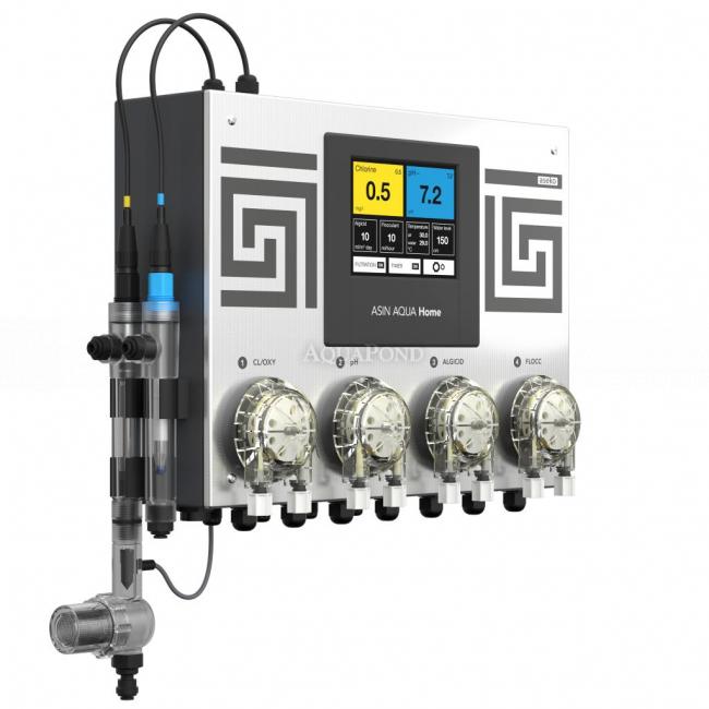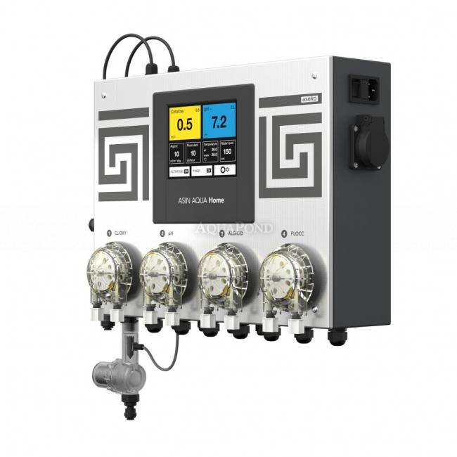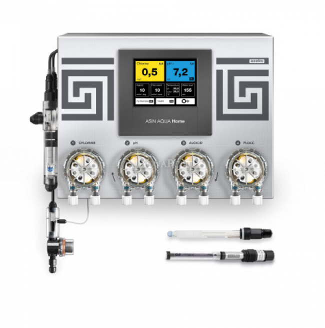 Čini kompaktnu jedinicu koja se sastoji od kontrolne jedinice, elektrode za mjerenje pH, slobodnog klora (CLF) i četiri dozirne pumpe kapaciteta 60 ml/min. Vrijednosti kemijskog statusa prikazuju se na ugrađenom dodirnom ekranu. Asin Home automatics standardno je opremljen i pomoćnim relejem za spajanje bazenske filtracije s ulazom do 1kW i senzorom temperature za provjeru i prikaz temperature vode u bazenu