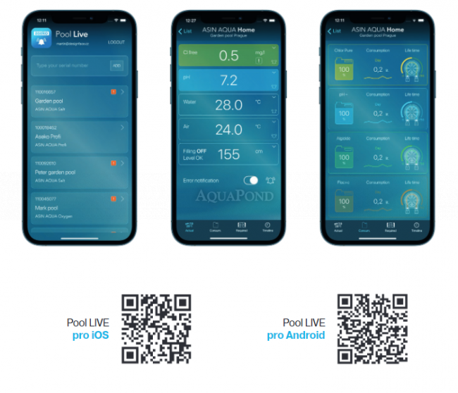Aseko Web uslugeASIN AQUA se može spojiti na Internet pomoću integriranog LAN adaptera. Podatke o bazenu možete jednostavno pratiti na: pool.aseko.com ili pomoću aplikacije Pool Live . Aseko Aplikacija Pool LiveAplikacija za iOS i Android telefone koja će vam dati pregled stanja vašeg bazena, gdje god ste spojeni na internet. ASIN AQUA automatski šalje poruku upozorenja na vaš pametni telefon ako je jedna od odabranih graničnih vrijednosti prekoračena ili se pojavi greška u sustavu. Možete jednostavno provjeriti količinu kemikalija u kanisterima kako biste na vrijeme naručili nove kemikalije. |