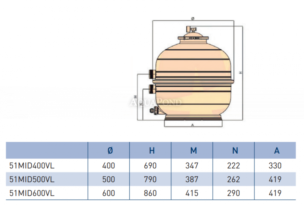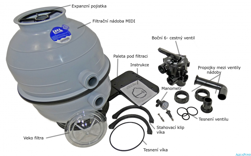 Filtarski spremnik MIDI 500 izrađen je od brizganog termoplastičnog materijala i zavaren najnaprednijom tehnologijom zavarivanja. Ima prozirni gornji poklopac, opremljen je manometrom, a šesteroputni ventil nalazi se na bočnoj strani posude. Pješčani filteri rade na prirodnom principu filtriranja vode. Voda prodire kroz sloj pijeska koji zadržava male nečistoće. Na taj se način pijesak prirodno začepi i potrebno ga je isprati, čemu služi šesteroputni ventil. Okretanjem ventila u položaj ispiranja pijeska mijenjamo smjer protoka vode i na taj način ispiremo nataložene nečistoće u otpad. Ovaj proces možemo ponavljati tijekom cijelog životnog vijeka pijeska, koji je vrlo dug u usporedbi s drugim metodama filtracije.