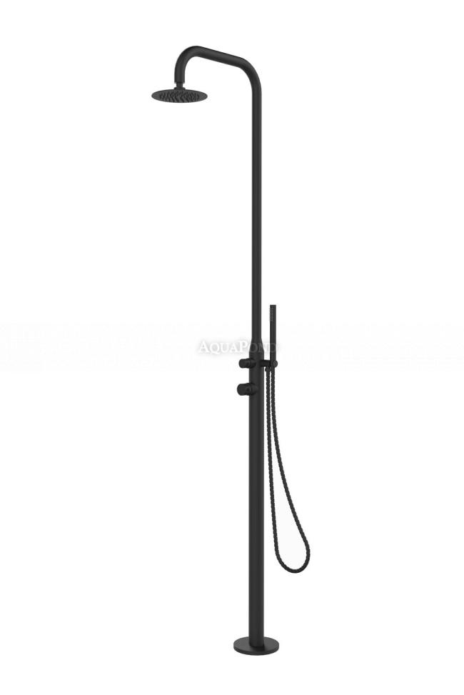 Vrtni tuš s opskrbom hladnom i toplom vodom. Juist tuš će vas na prvi pogled impresionirati svojom hladnom elegancijom, visokokvalitetnim materijalima i jednostavnom ugradnjom. Ugradnja se provodi pomoću montažne kutije koja se ukopava u zemlju. Prednost ove ugradnje je u tome što se cijevi za vodu spajaju samo na montažnu kutiju, a tuš se jednostavno spaja i pričvršćuje na montažnu kutiju pomoću priloženih vijaka. To znači da se tuš može vrlo brzo rastaviti za zimu bez potrebe za odvijanjem cijevi za vodu. Montažna kutija je naravno uključena u isporuku. Jednoručna miješalica koristi se za regulaciju temperature vode i podešavanje protoka vode. Druga polužna miješalica prebacuje se između kišnog i ručnog tuša. Prikladan je dodatak svim vrstama obiteljskih bazena, praktičan, jeftin i praktičan izvor tople tehnološke vode u rekreacijskim objektima, u vrtnim kolonijama, na malim sportskim objektima i u vrtovima obiteljskih kuća.