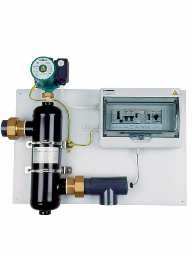 Kompaktna jedinica izmjenjivača - sastavljena od: Izmjenjivača topline (mjed/plastika 1,5"/50 mm navojni otvori. Wilo cirkulacijska pumpa (na primarnom krugu 1"). Bušotine za senzor temperature termostata. Električna automatika s prekidačem, osiguračima i preklopni elementi koji kontroliraju temperaturu vode, preklopni filtarski uređaj s termostatom.Cijeli set je montiran na ploču.