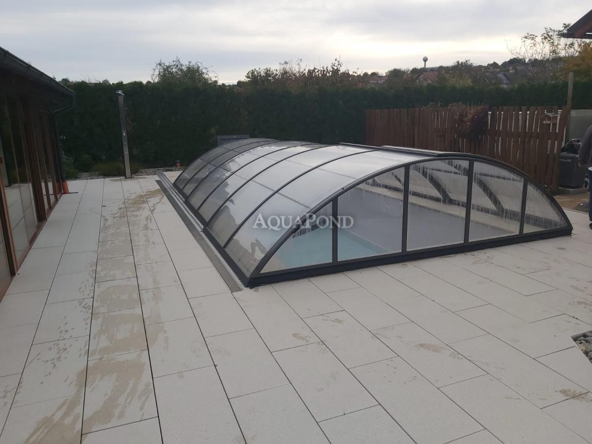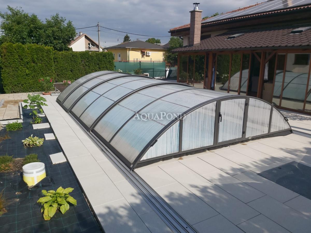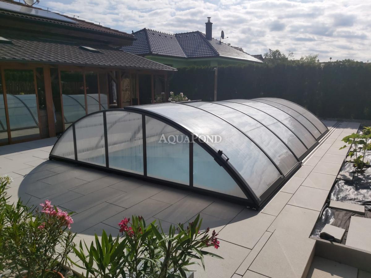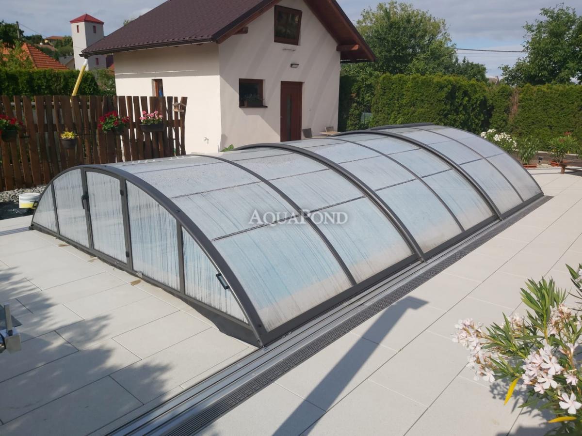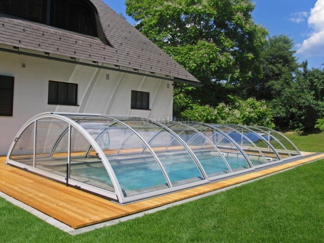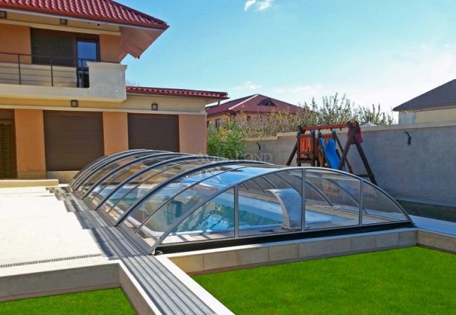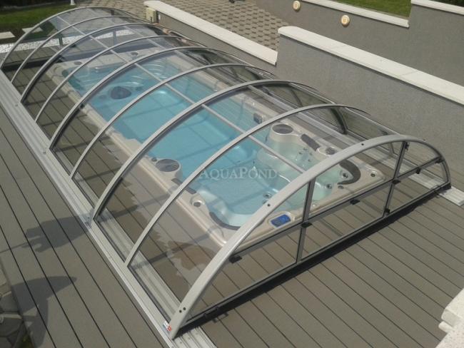Niska nadstrešnica jednostavnog oblika. Ima stakleni kompaktni polikarbonat. Omogućuje potpuno korištenje bazena u otvorenim i zatvorenim uvjetima. Pročitajte više
