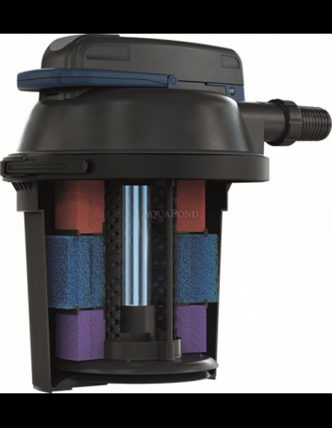 FiltoClear 13000 tlačni filter s integriranom UV lampom od 24 W. Brzo i učinkovito jamči uživanje u čistoj vodi u ribnjaku. Onečišćena voda iz ribnjaka pumpa se u dobro zatvoreni sustav - tlačnu posudu. Može se u potpunosti ugraditi u zemlju ili se može postaviti iznad vodopada i ima praktično čišćenje bez potrebe za otvaranjem filtera zahvaljujući patentiranoj tehnologiji Easy-Clean. Filter se može lako sakriti u blizini ribnjaka zakopavanjem u zemlju i prekrivanjem filterom FiltoCap stone grey. Filtar je idealan za napajanje malih potoka, kaskada i slapova. Prilikom čišćenja filtra spužve se istiskuju pomoću ručke na vrhu filtra, prebacivanjem Easy-Clean ventila voda koja teče ispire prljavštinu iz filtra. Uključuje jednostavno praćenje protoka vode, začepljenja filtera i UVC aktivnosti. Kompaktna veličina koja pruža visoku učinkovitost - izvrsno rješenje za ribnjake s ograničenim prostorom. Izrađen od visokokvalitetnog i izdržljivog materijala.